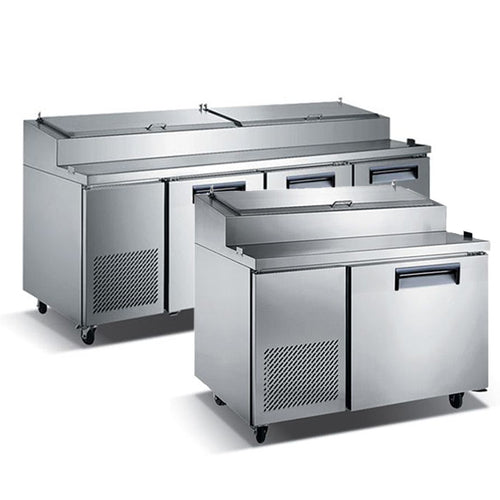 Pizza prep tables are essential for keeping pizzerias of all sizes running smoothly. Each table is equipped with a cutting board and food pans, allowing you to keep sauces, toppings and other ingredients at your fingertips. The hinged insulated cover keeps toppings cold when not in use, and additional supplies can be stored in the refrigerated cabinet below for quick access when needed. Available in various sizes and capacities. ETL Listed and ETL Sanitation.