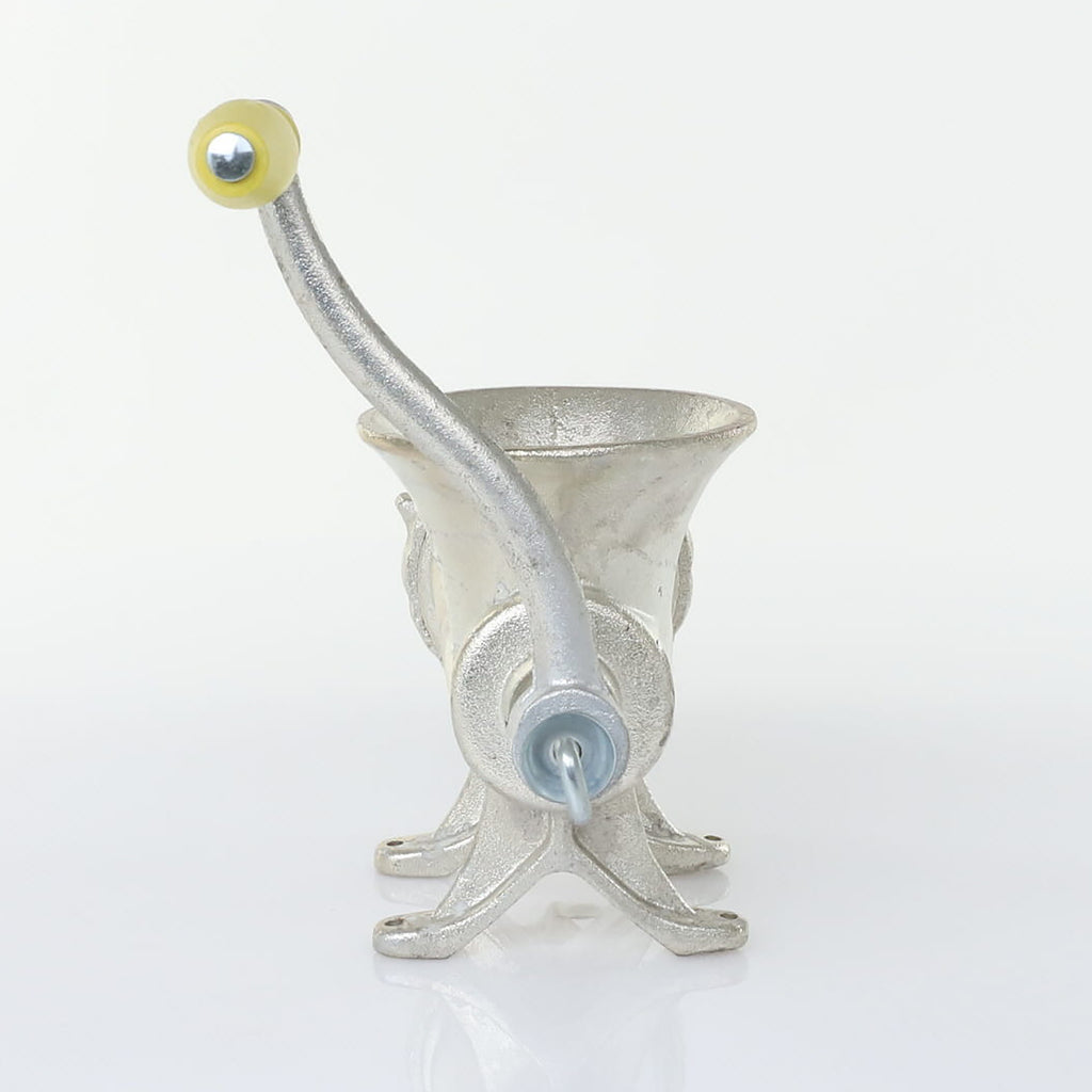 Simple and easy to use, this cast iron, Adcraft Manual Meat Grinder is designed to insure quality and durability while saving you cost. No electricity needed as you simply place the pieces of meat into the grinder and turn the hand crank. The heavy duty body and Stainless Steel blades make grinding all kinds of meat easy and quick. This sleek unit is tin-plated to make it sanitary and attractive, and comes complete with knife and 3/16 " plate. The fully enclosed blades and stable body design enhance safety, making meat-grinding smooth and worry-free. Minimal upkeep and ease-of-use make this Adcraft Manual Meat Grinder the perfect kitchen helper for all occasions.