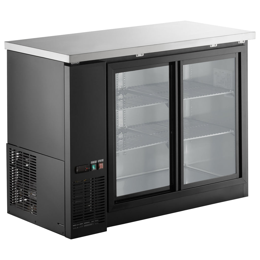 The U-Star 2 Sliding Glass Door Narrow Depth Back Bar Cooler is designed to store and merchandise beverages in bars, restaurants and other foodservice establishments where space is at a premium. This commercial back bar cooler has a 24" narrow depth, which is great for areas with limited bar space. The unit has two sliding glass doors to enhance product visibility and provide easy access to the contents, plus four plastic-coated wire shelves to store and organize a variety of beverages. This back bar cooler has 11.2 cubic feet of refrigerated storage that holds kegs, cans or bottles. The unit is constructed of a durable black steel exterior with an all stainless steel countertop, interior floor and walls. LED interior lighting illuminates the inside of the unit, attractively showcasing your drinks. The unit has a temperature range of 33°F to 41°F (1°C to 5°C), which keeps beverages chilled at the perfect serving temperature. Additional features of this two door bar fridge include a side mounted compressor, foamed-in-place polyurethane high density cell insulation throughout the entire cabinet, and automatic defrosting. The unit uses environmentally friendly R290 refrigerant. This model is cETLus and ETL Sanitation. With its sleek design, this back bar cooler enhances the overall aesthetic of your bar area. Great for merchandising and storing beer, soda and other beverages, the U-Star 2 Sliding Glass Door Narrow Depth Back Bar Cooler is an excellent way to maximize your space while keeping beverages perfectly chilled and ready to serve. Covered by the U-Star Two-Year Warranty on Parts and Labor and Five-Year Warranty on the Compressor.